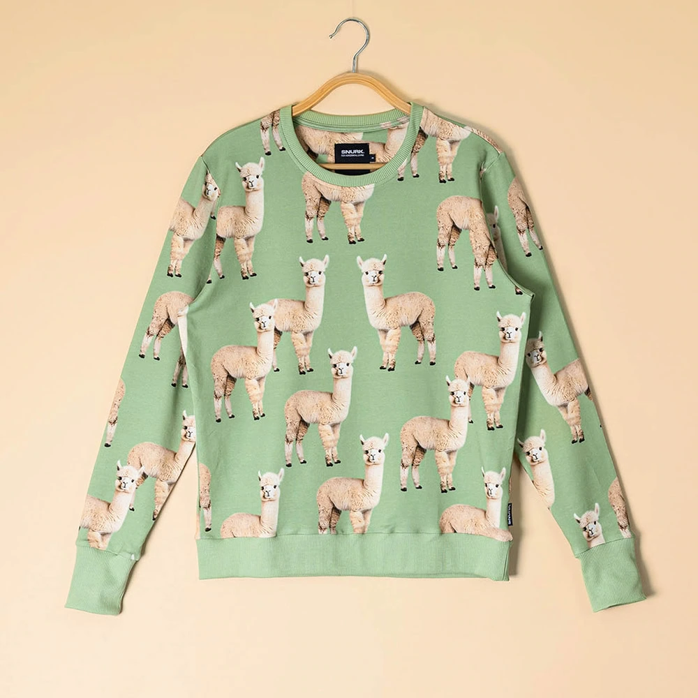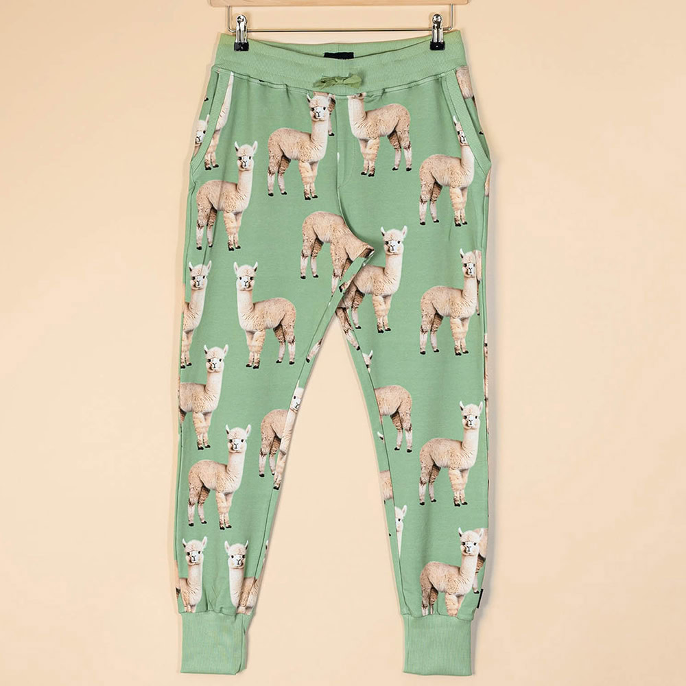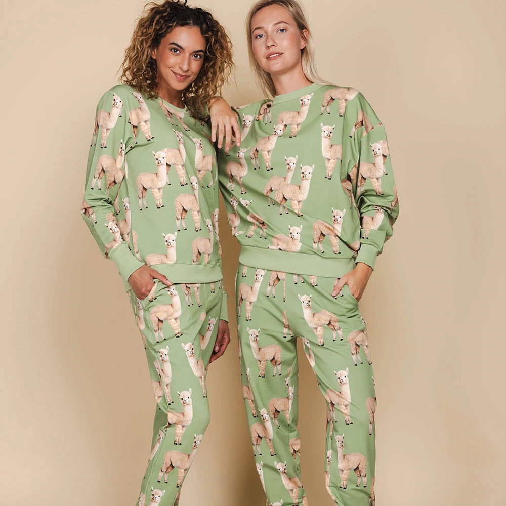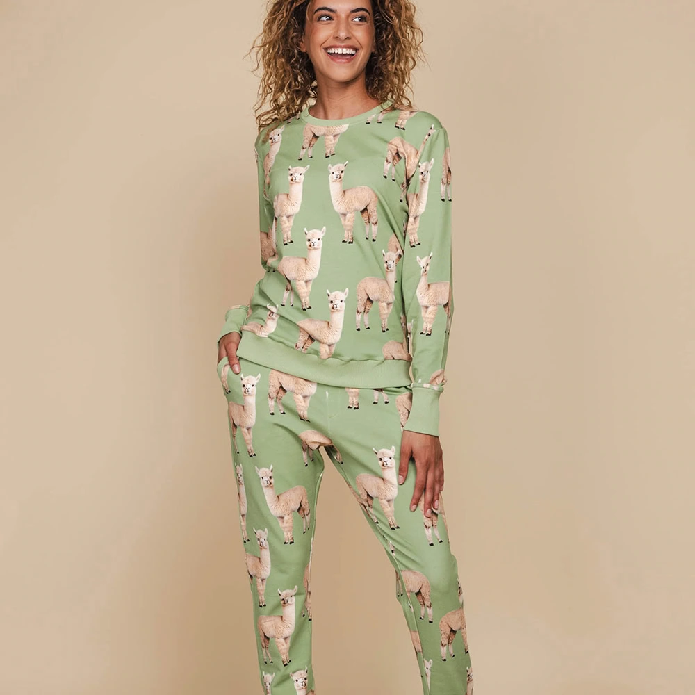 Geniet van ultiem comfort met deze zachte sweater- en broekset van biologisch katoen met speelse alpacaprint, perfect om stijlvol in te relaxen.