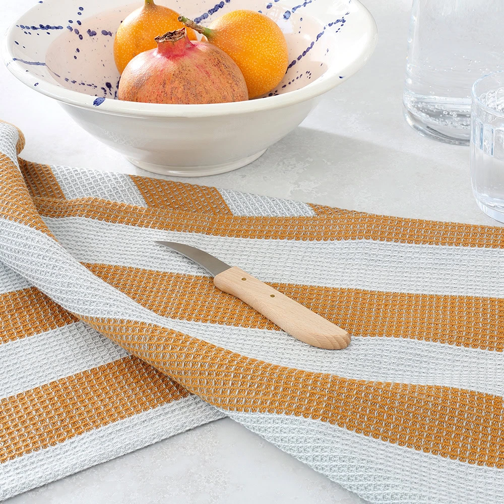 Deze lichte maar sterke keukenhanddoek neemt vocht snel op en is eenvoudig te onderhouden. Het moderne streeppatroon in cinnamon/ platin geeft je keuken een stijlvolle en harmonieuze uitstraling.