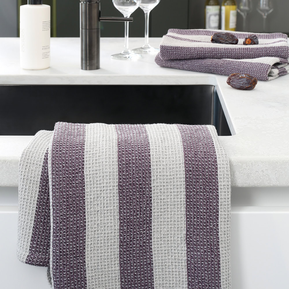 Deze lichte maar sterke keukenhanddoek neemt vocht snel op en is eenvoudig te onderhouden. Het moderne streeppatroon in plum/ platin geeft je keuken een stijlvolle en harmonieuze uitstraling.