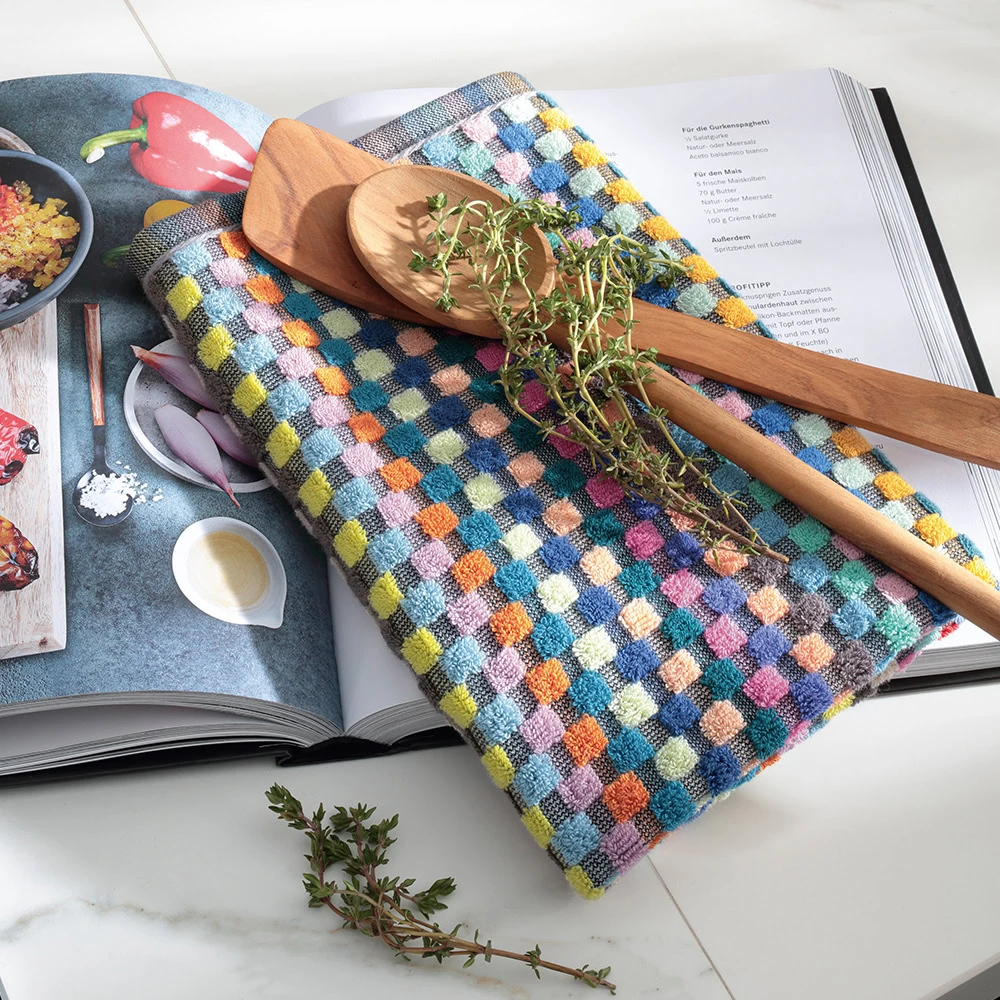 De Cawö keukenhanddoek keukenhanddoek Pro Confetti is een vrolijk gekleurde keukenhanddoek met een multicolor ruitjespatroon. De handdoek is 50 × 50 cm en is gemaakt van 100% katoen (frotté) met een gewicht van 440 g/m², wat zorgt voor een stevige en duurzame kwaliteit. Het product is Made in Germany en staat bekend om zijn huidvriendelijkheid en hoogwaardige afwerking.