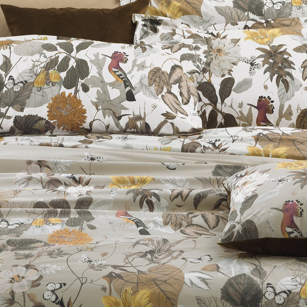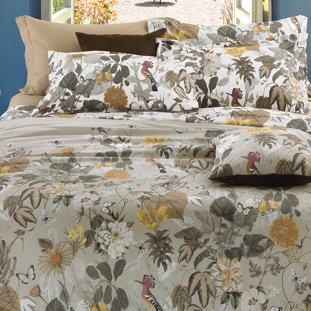 Dekbedovertrek van Egyptisch katoensatijn met een rijke bosprint in warme herfsttonen, versierd met bloemen, bladeren, vogels en vlinders.