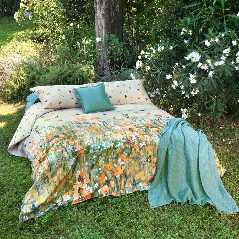 Ontdek het luxe dekbedovertrek dat bloeit als een kleurrijk bloemenveld. Het Egyptisch percal katoen Sunfield dekbedovertrek is rijkelijk versierd met bloemen en vlinders op een zandkleurige ondergrond. Alsof je in een veld tussen de bloemen ligt, met een speels maar elegant effect.