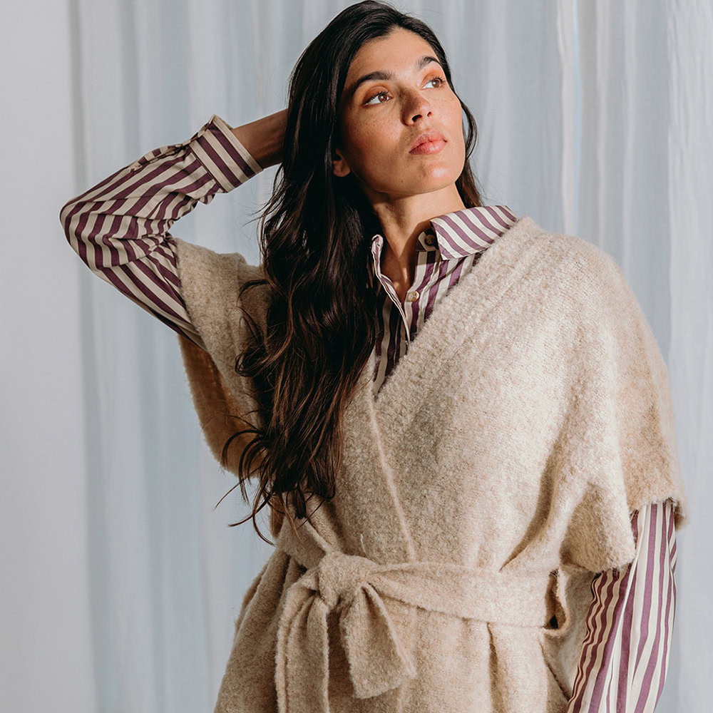 Omhul jezelf in comfort en stijl met dit tijdloze, zachte gebreide vest. Dankzij zijn luxe bouclé- textuur en elegante ceintuur past het ‘Dré’ vest bij elke outfit en geeft het jouw outfit een complete look. Heerlijk aangenaam voor binnen, maar ook mooi om buitenshuis te dragen!