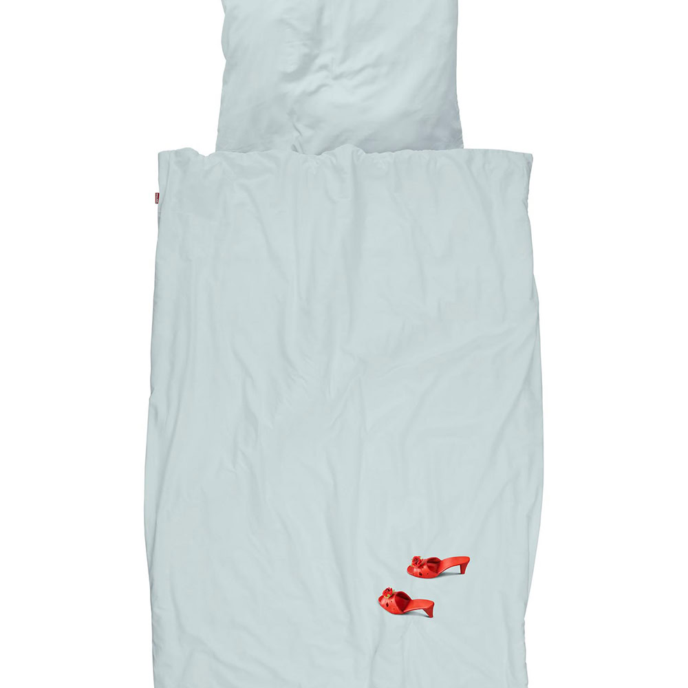 Ze blijven dansen, zonder ooit te stoppen. Over zachtblauw, biologisch katoen bewegen de rode schoentjes sierlijk tot aan het voeteneinde. Zo verandert jouw bed in een betoverende dansvloer uit het Sprookjesbos
