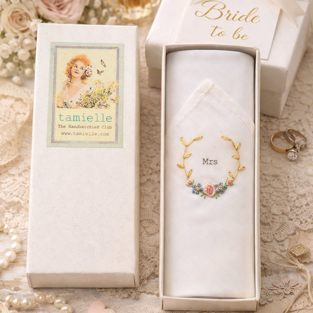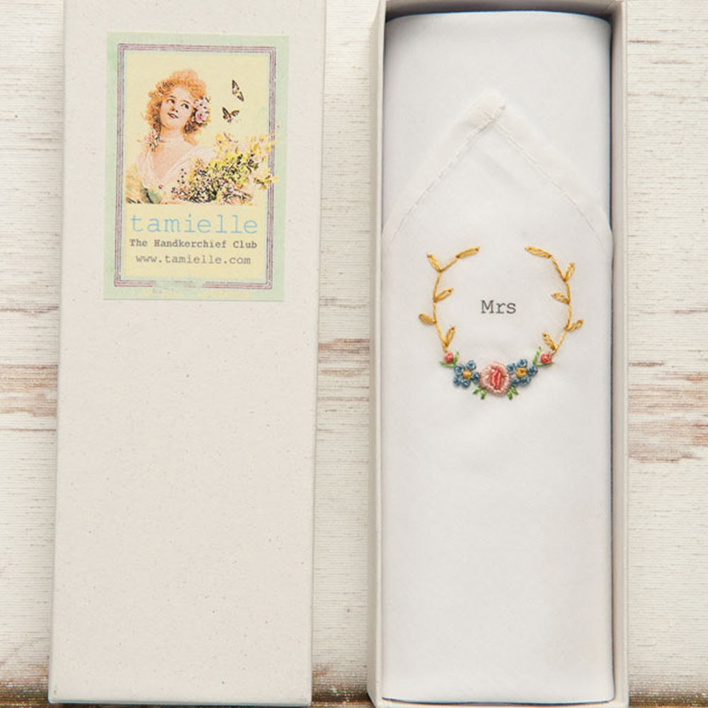 De katoenen bruidszakdoek met handgeborduurd ‘Mrs’ is een prachtig en persoonlijk cadeau voor de bruid in spé.