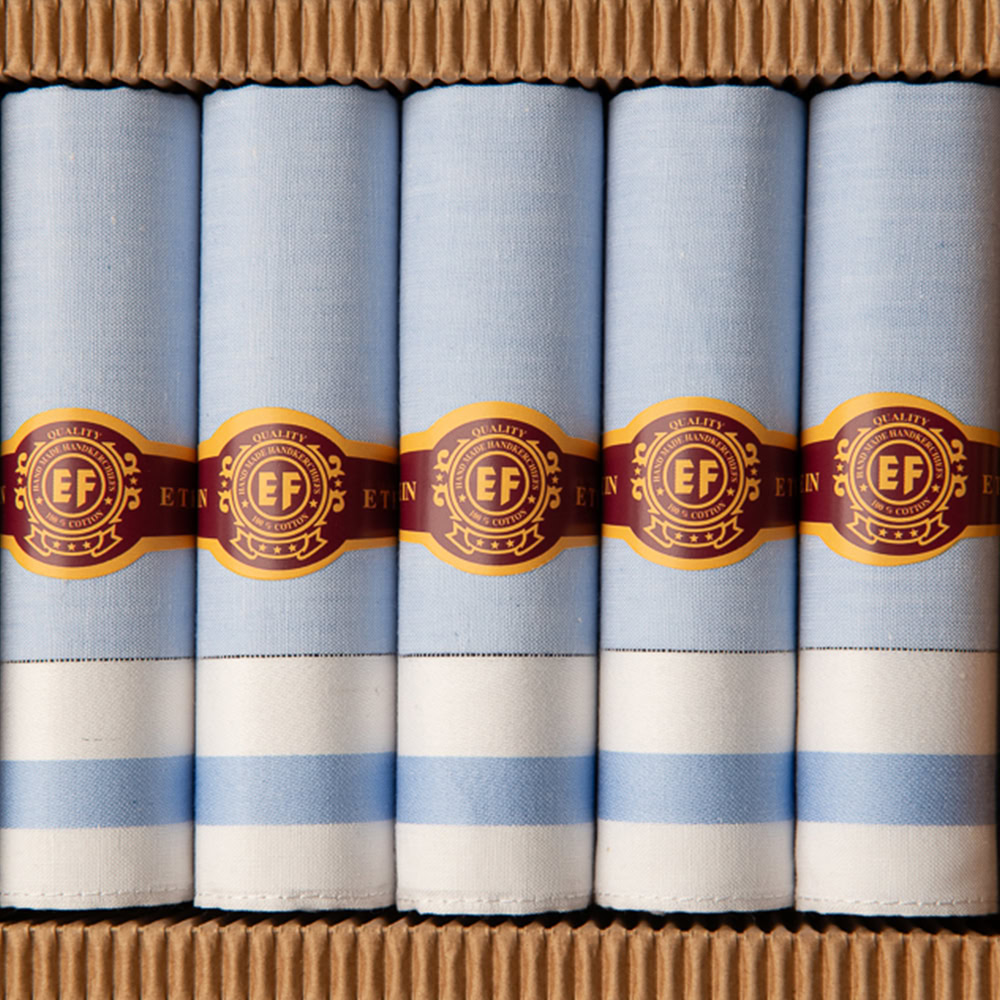 De heren zakdoeken van ETEX zijn per 5 stuks verpakt in een sigarendoosje. Gemaakt van hoogwaardige kwaliteit van 100% zachte katoen.
