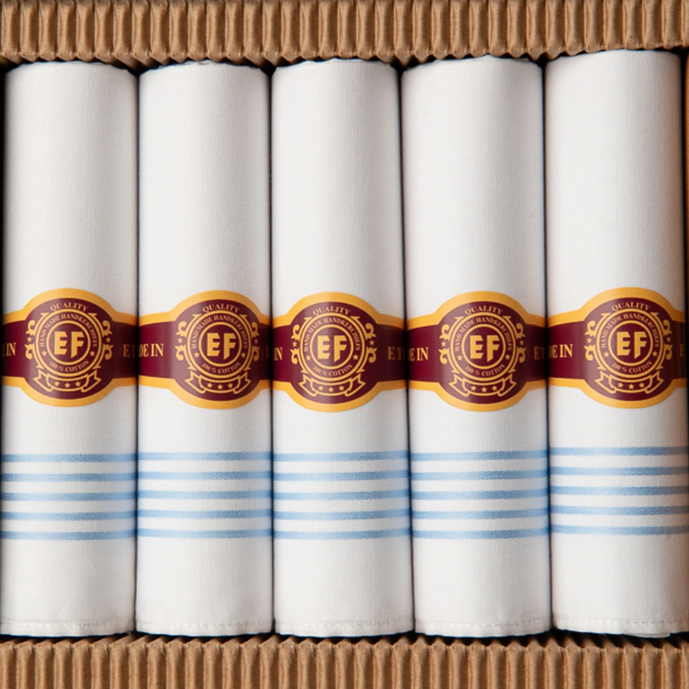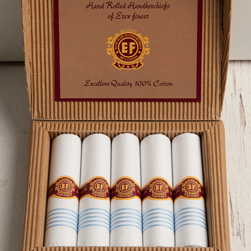 De heren zakdoeken in wit met blauw zitten per 5 stuks verpakt in een sigarendoosje. Gemaakt van hoogwaardige kwaliteit van 100% zachte katoen.