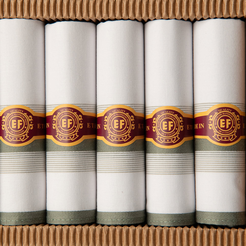 De heren zakdoeken van ETEX zijn per 5 stuks verpakt in een sigarendoosje. Gemaakt van hoogwaardige kwaliteit van 100% zachte katoen.
