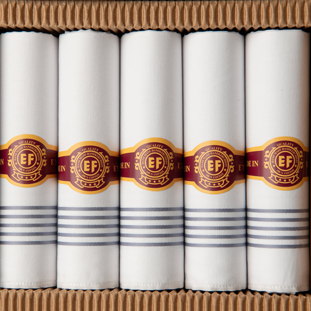 De heren zakdoeken in wit met grijs zitten per 5 stuks verpakt in een sigarendoosje. Gemaakt van hoogwaardige kwaliteit van 100% zachte katoen.