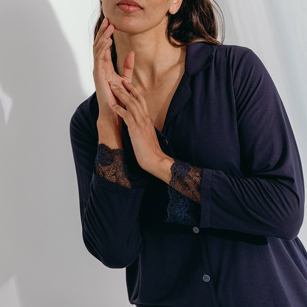 Jasmine Pyjama Marine is iets voor jou als je op zoek bent naar een luxe dames pyjama met knoopjes. Deze elegante pyjama met relaxte broek heeft een prachtige afwerking en is voorzien van kant. De stof is super zacht om te dragen en om in te slapen.