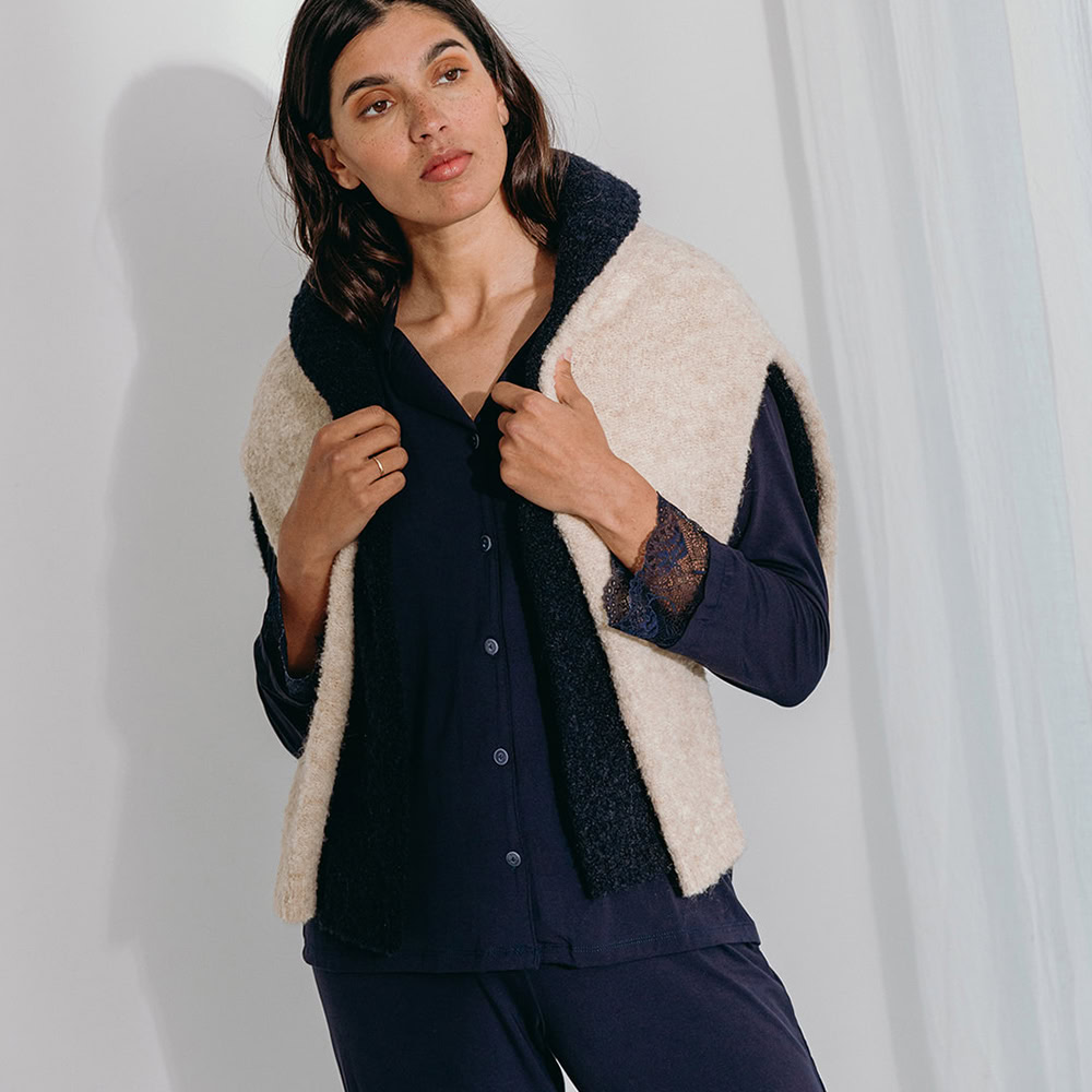 Ontwerp: Superzachte modal, tijdloze pasvormen, knoopsluiting aan de voorkant, fijnste kwaliteit kant, relaxte broek & ontwerp met lange mouwen