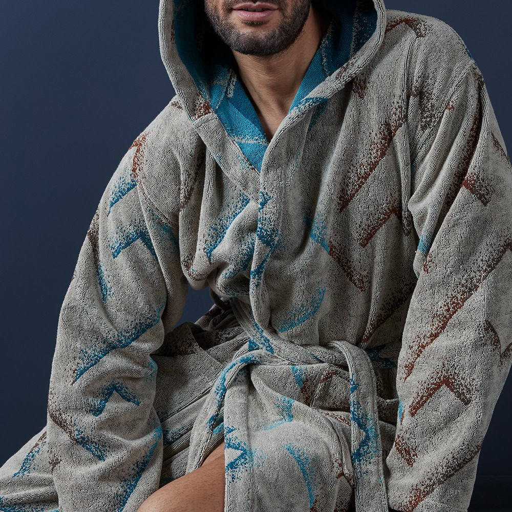 Luxe badjas Mirabello – Kanzi unisex met capuchon is een stijlvolle badjas met een speels patroon in kleurtinten beige- blauw- bruin. De badjas heeft een lengte van de badjas is 120 cm (gemeten vanaf de schouders) en hij is voorzien van zijzakken. Deze Mirabello badjas is geschikt voor zowel vrouwen als mannen (unisex model). Leuk detail is dat de binnenzijde anders van kleur is dan de buitenkant. De buitenkant heeft als ondergrond beige van kleur, terwijl de binnenkant kleurrijk is, met blauw, bruin en terracotta bruin. Het materiaal is 100% badstofkatoen aan zowel de binnen- als buitenkant. De stof absorbeert goed, waardoor de badjas perfect is voor na het douchen of een bezoek aan de sauna. Uiteraard is deze badjas met capuchon ook ideaal als ochtendjas voor een ontspannen dag thuis.