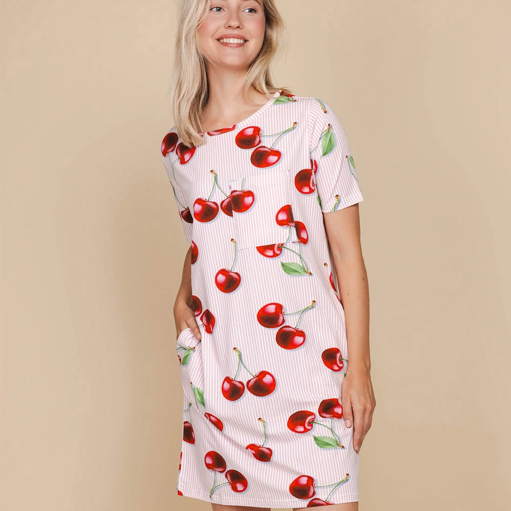 Zoet, speels en comfortabel: dit kersenjurkje steelt de show. Mon Cherry T-shirt Dress Dames van Snurk is vanaf nu jouw nieuwe favoriete relaxjurk.
