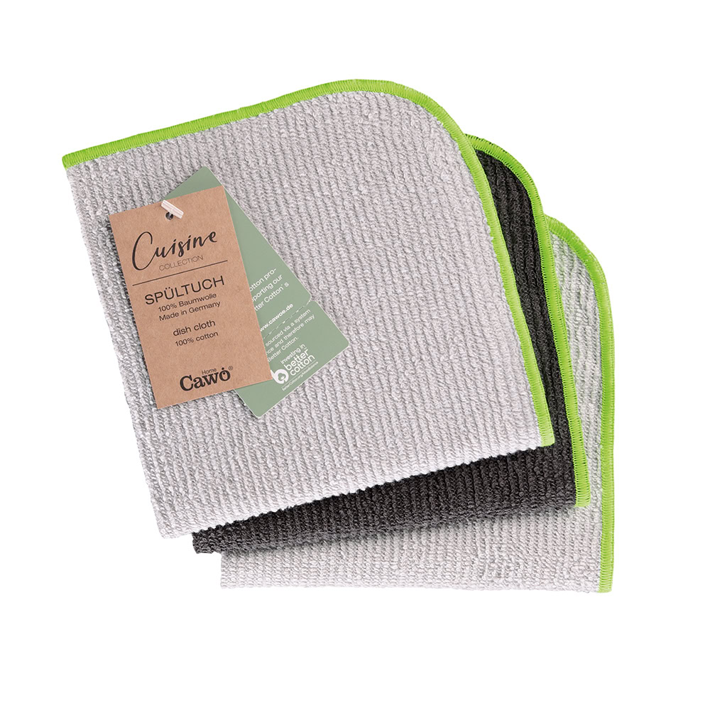 Set van drie stuks vaatdoeken in grijs met frisse neongroene bies. Gemaakt van dikke katoen in de afmeting 30×30 cm. De Cawö vaatdoeken zijn van hoogwaardige kwaliteit en gaan lang mee.